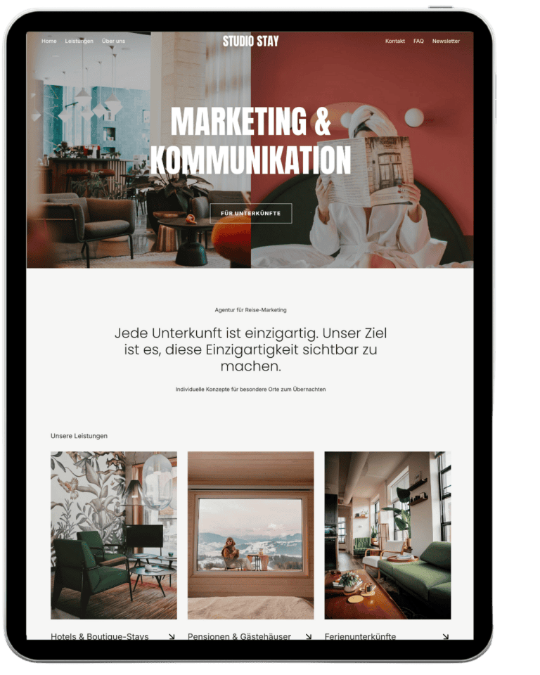 Studio Stay ist spezialisiert auf Marketing und Kommunikation für Unterkünfte. Mit jahrzehntelanger Reiseerfahrung und fundierter Expertise in Marketing, Social Media & PR verhilft die Agentur Hotels, Pensionen und Ferienunterkünften zu mehr Sichtbarkeit, Reichweite und Gästebindung.